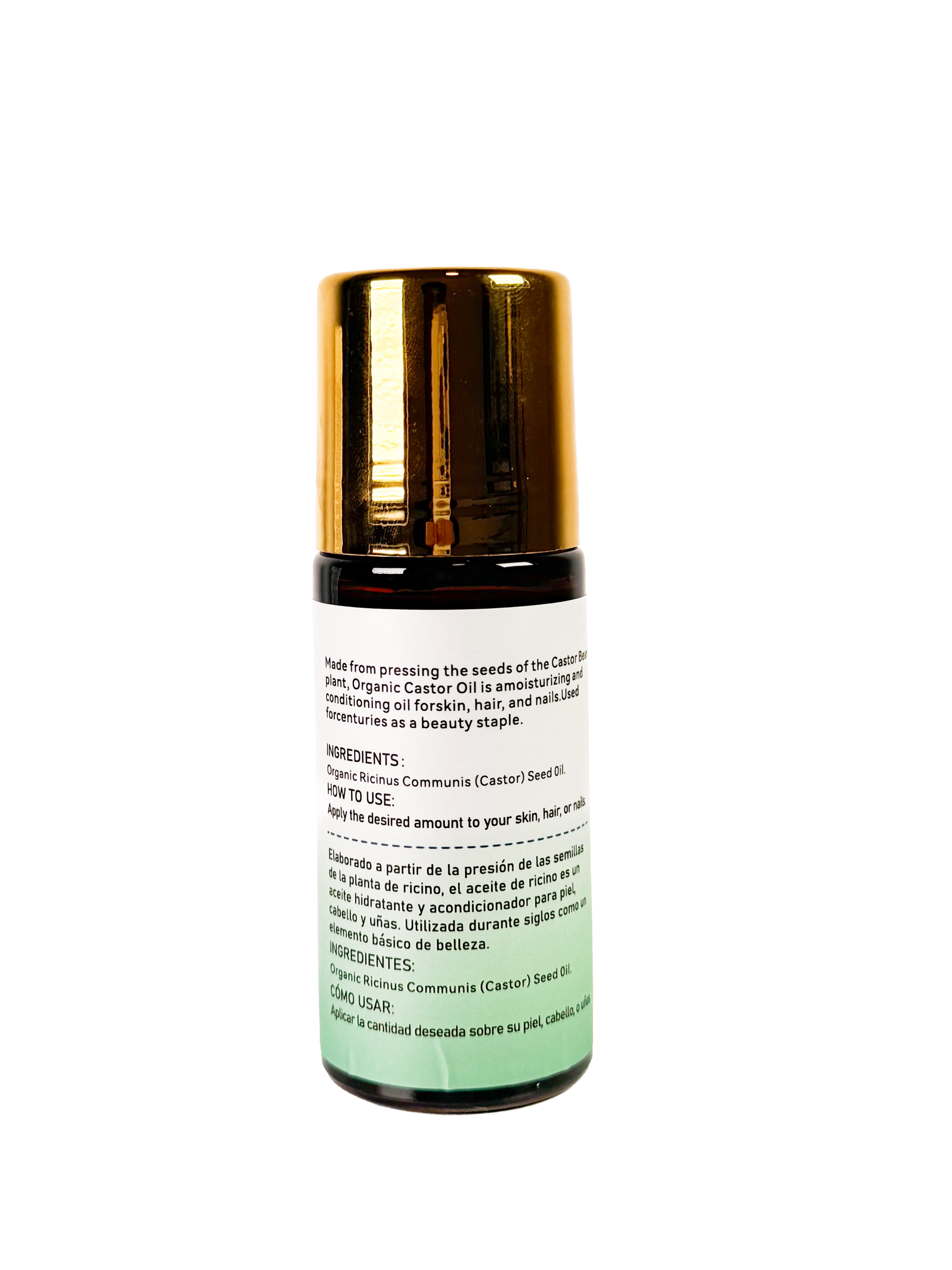 Aceite de ricino orgánico, 100% puro, prensado en frío (expeller pressed) y libre de hexano, presentado en práctico envase con rodillo de cuarzo rosa para una aplicación precisa y cómoda.
