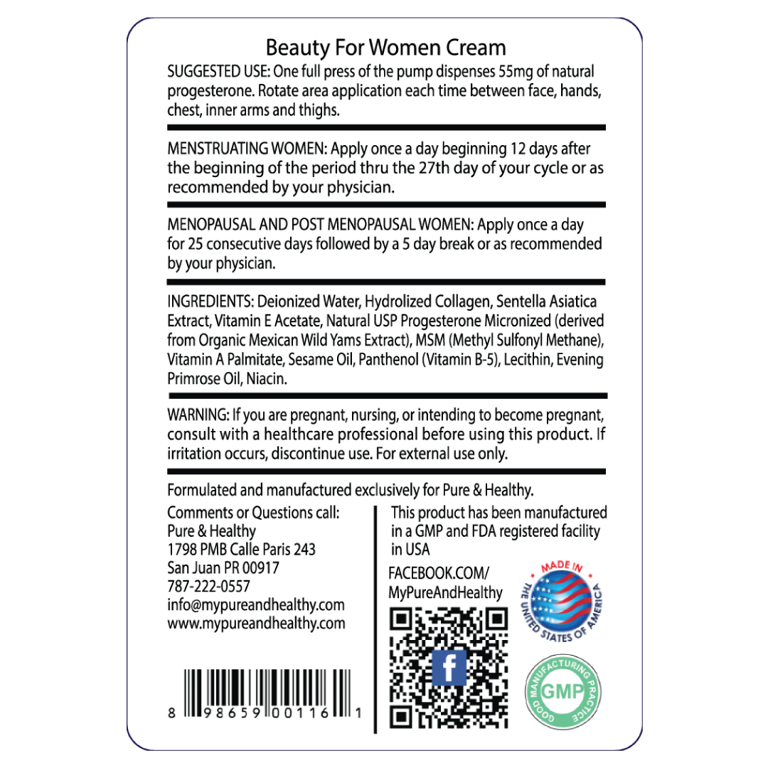 Beauty for Women es una crema de progesterona con colágeno. La progesterona proporciona equilibrio hormonal a las mujeres, mientras que el colágeno ayuda a fortalecer la piel. Utilizamos progesterona orgánica elaborada a partir de ñame silvestre orgánico.
